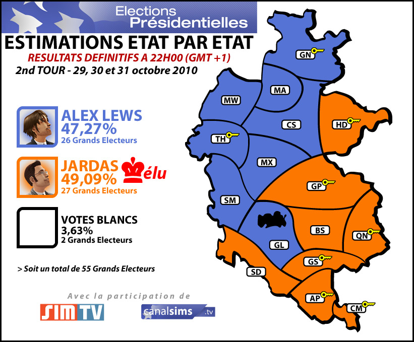 L'élection présidentielle d'octobre 2010 pourvoit au remplacement de Djay à la fonction de Président de la Nation de Simland. A l'issue des inscriptions, 3 candidats se sont présentés. Alex Lews, sans étiquette et avec au départ Aachenar puis finalement Napoléon La Violette comme colistier, ils forment un duo qui avait déjà eu lieu, suite à l'élection d'avril 2009. Jardas candidat centriste avec Magellan comme colistier et enfin Gérald Golay qui est sans étiquette et sans colistier.
