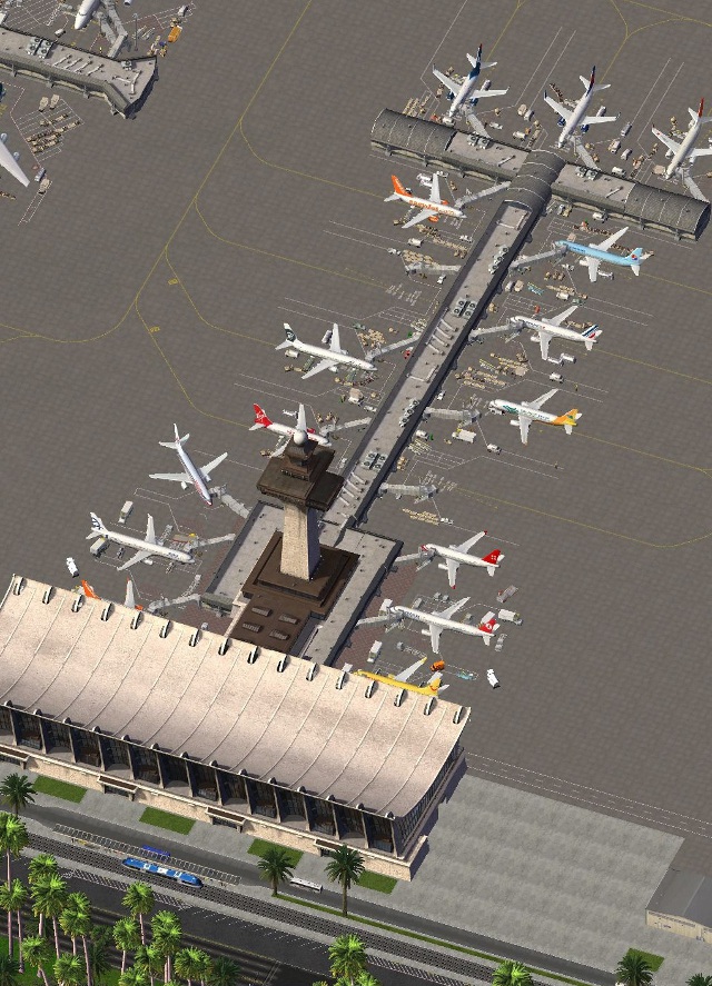 Ces terminaux en béton armés sont éclairés par de vastes baies vitrées donnant une vue panoramique sur le tarmac.