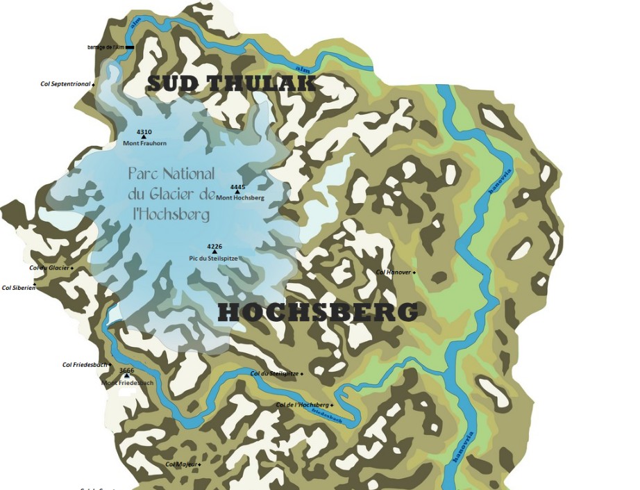 -La vallée de l'Alm au nord est une vallée rurale attirant les touristes et permettant le développement énergétique du nord de la Whamphalie grâce à son barrage hydraulique. L'Alm est apprécie des touristes fan de sport extrême (canoë-Kayak, deltaplane...) mais n'est pas utilisé pour la navigation car son débit est trop dangereux pour ça. Autrefois, l'affluent de l'Hanovria servait de frontière naturelle entre le Thoulak et le Royaume des Heschburg.
