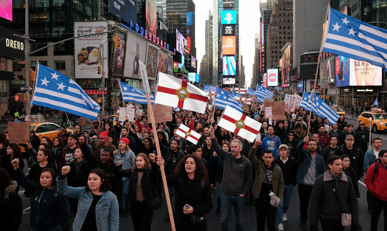 Manifestation à New Amsterdam suite à l'arrestation et à la mort du roi du Queens, pour le retour à l'état de droit et à la fédération de Simland