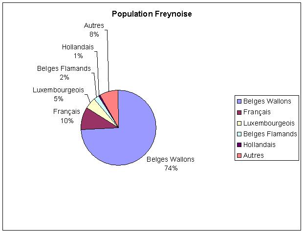 Longtemps isolée et inconnue, Freynes a gardé une population peu diversifiée. En effet, celle ci est encore composée de 74% de Belges Wallons, peuple fondateur de la ville. Voici comment se répartit la population: