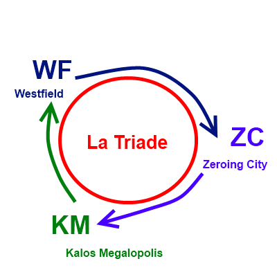 La Triade, comme son nom l'indique, est formée des 3 villes de premier plan économique à savoir Zeroing City, Westfield et Kalos.