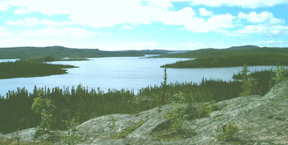 Ainsi des formations de roche sédimentaire sont apparentes sur les rives de la presqu’il titan du lac du même nom avec strates visibles qui se sont déposées sous les mers anciennes; les rives sud et est du Lac Titan dévoilent un relief granitique.