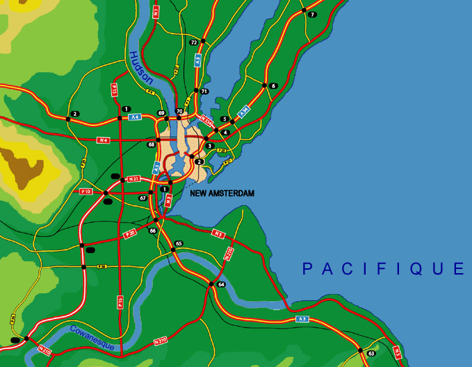 - Autoroute A34 c'est une variante de l'autoroute A3. Elle contourne New Amsterdam par le sud-est en traversant Staten Island, puis elle franchit l'entrée de la baie sur le Verrazanno Bridge et elle parcourt Brooklyn, le Queens et le reste de Long Island pour se reconneter à l'autoroute A3 plus au nord.