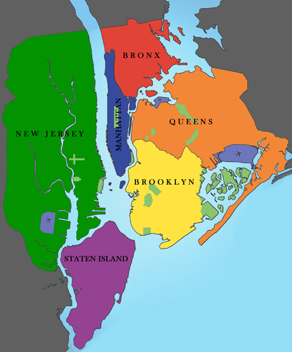 - Bronx: situé au nord sur le continent, ce borough correspond au quartier pauvre accueillant les minorités noires et hispaniques; mais également le Yankee Stadium et l'Université d'état du Queens.