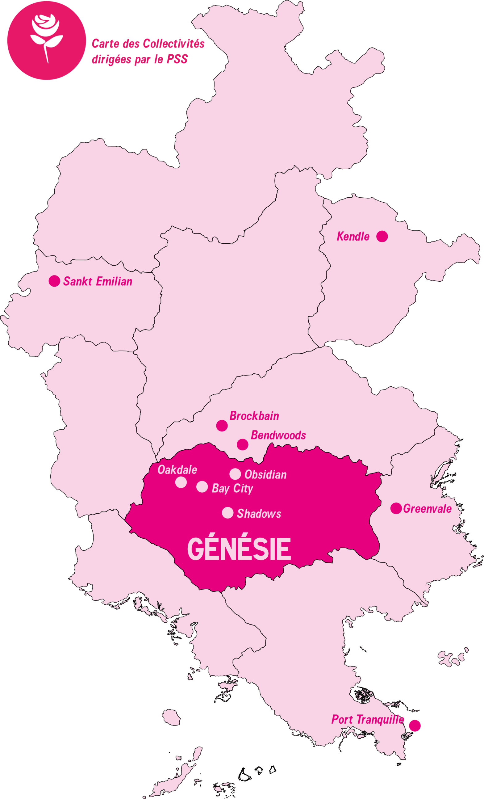 La plus développée était sans conteste celle de la Génésie, qui regroupait à elle seule 2850 des 6 143 membres du Parti Socialiste Simlandais (3 des 6 membres réels). Le PSM au Simland Méridional regroupait 1 987 membres, Les autres antennes étaient généralement RP mais participaient à la représentation du parti à Simland.