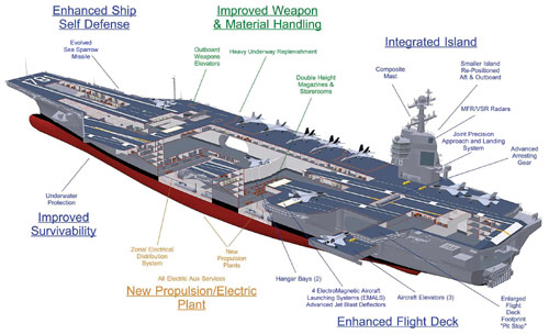 Les deux réacteurs nucléaires à eau A1B équipés de 4 arbres d'hélices de 4, 5 lames chacune, permet de déplacer les 111 300 tonnes du navire à une vitesse de croisière de 34.5 nœuds.