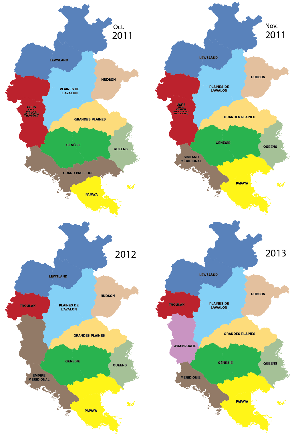Une frontière change à la fin de l'année 2012, l'ancien état des Snowy Mountains étant en effet largement perdant de sa régionalisation avec le Thoulak, après qu'on lui aie imposé un régime communiste. Il est alors renommé Nordmeridien-Whamfalen et est intégré à un nouvel état, l'Empire Méridional, avec le Simland Méridional. Au retour de l'ancien gouverneur des Snowy Mountains, Wham17000, la polémique sur ce choix, déjà relativement présente, explose, et l'on pointe alors ce qu'on appelle une "colonisation des Snowy Mountains", qui sont toujours aussi laissées de côté. Cela aboutit à une décision du Président de la Fédération, tout juste élu, Alex Lews, de faire passer le nombre d'états de 9 à 10 en rendant son indépendance aux Snowy Mountains, qui deviennent Whamphalie.