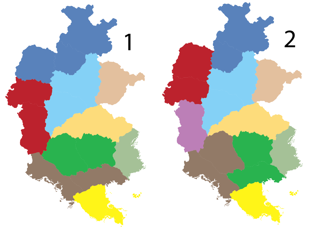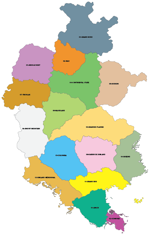 Plusieurs cartes sont alors proposées, en plusieurs vagues, afin de bien sonder l'opinion publique. Certaines propositions sont alors très contestées (comme une fusion Columbia - Simland Méridional qui fait grand bruit, avec une user-bar récurrente dans les signatures des résidents de ces deux états), etc. Certains états sont délibérément épargnés par la régionalisation, comme l'Hudson qui est déjà le résultat d'une fusion d'états, le Queens et les Grandes Plaines. Après 3 vagues de propositions de cartes, le ministre L. Angelus finit par proposer deux cartes finales, qui sont soumises au vote. Elles sont sobrement appelées "Carte 1" et "Carte 2".