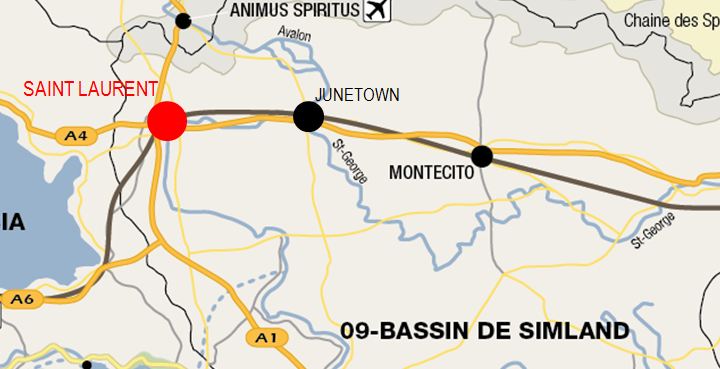 Saint-Laurent et sont agglomération sont situé au centre de Simland, dans l'ex-Bassin de Simland (dont elle était la capitale) en Génésie. On trouve à proximité, les Chaînes des Spiritaines et les Grandes Plaines dont la commune en est le "verrou". C'est d'ailleurs pour cette raison qu'une ancienne base militaire y à était construite pour surveiller la | République Socialiste et Populaire d'Azaleas.
