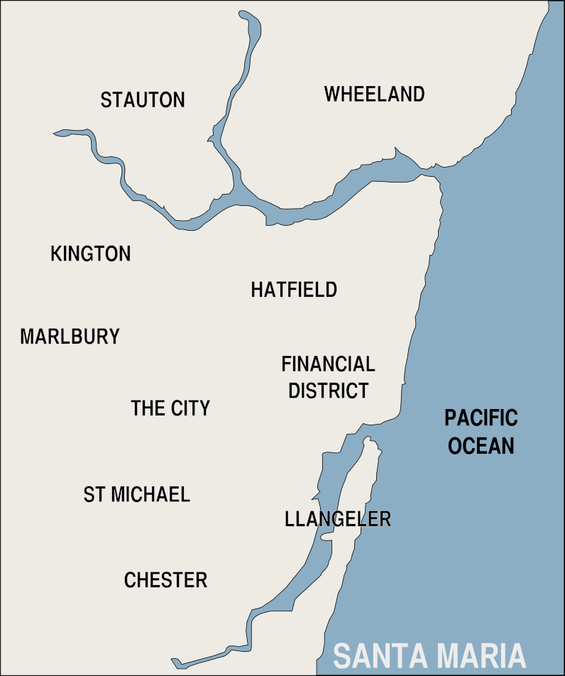 L'aire urbaine de Santa Maria est séparée en plusieurs districts et quartiers constitués au fil du temps autour d'anciens villages progressivement inclus dans la ville. Il existe officiellement 10 districts qui découpent la ville, même s'il existe des zones non-officielles auxquelles on fait souvent références par habitude (par exemple le Port de Santa Maria qui géographiquement se situe dans plusieurs districts). Les districts de la City et de St Michael constituent le cœur historique de la ville où se situe la plupart des administrations; les activités financières sont quand à elles concentrées au sein du Financial District; et enfin les activités industrielles et commerciales sont en grande partie localisées dans les districts de Wheeland (Port et Gare de marchandise), Stauton (l'Aéroport International) et Hatfield.