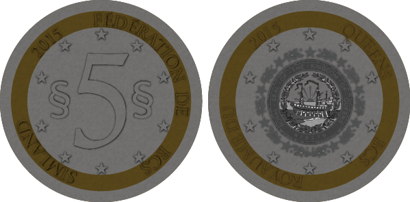 La pièce de 2 simléons est illustrée avec le portrait du Lieutenant-Général Piaget-Maurer (élu de 2010 à 2016). La pièce de 5 simléons porte le drapeau de l'état. |