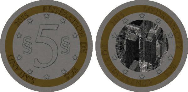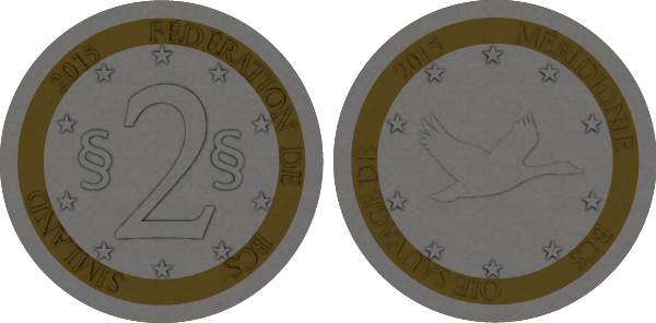 La pièce de 2 simléons est ornée d'un symbole méridional : l'Oie sauvage. La pièce de 5 simléons présente une vue stylisée et aérienne de Medrean City, une des villes phare de la Méridionie. |