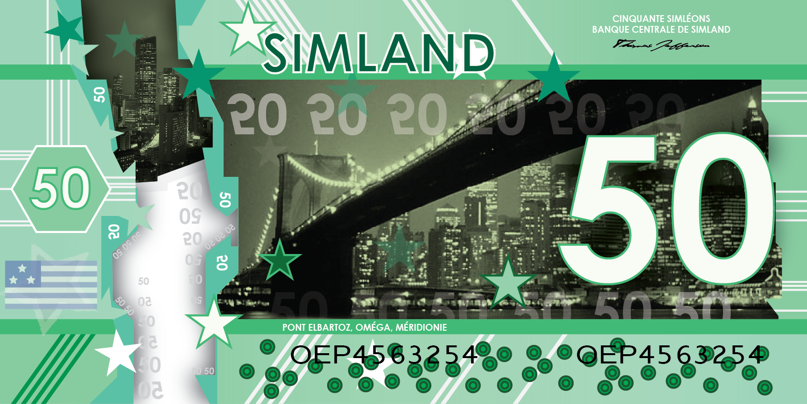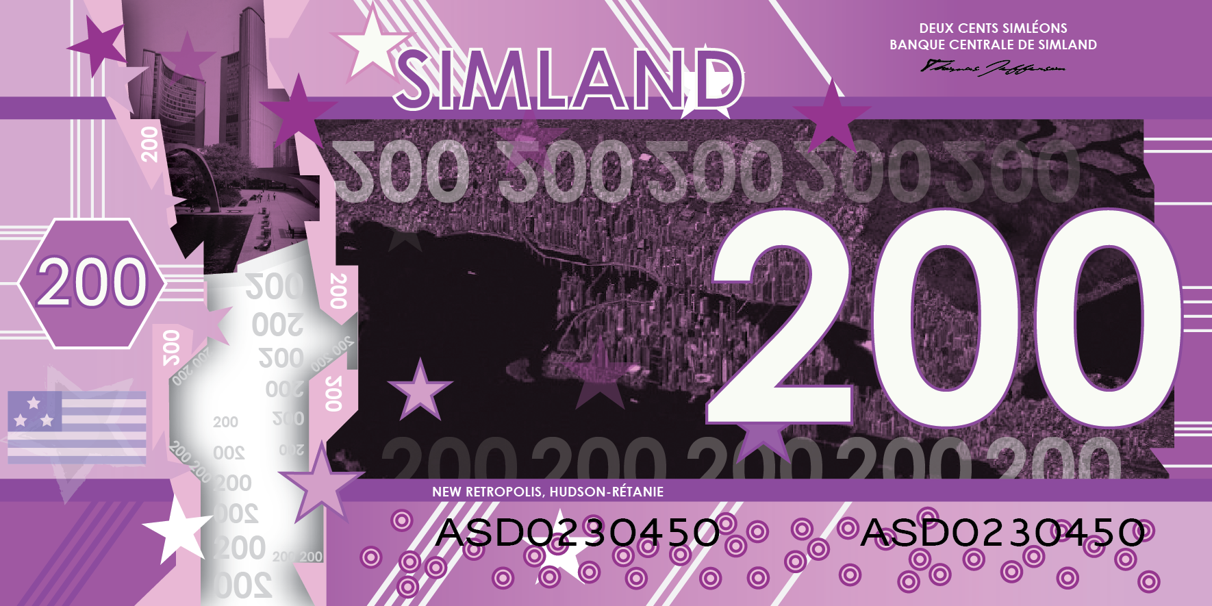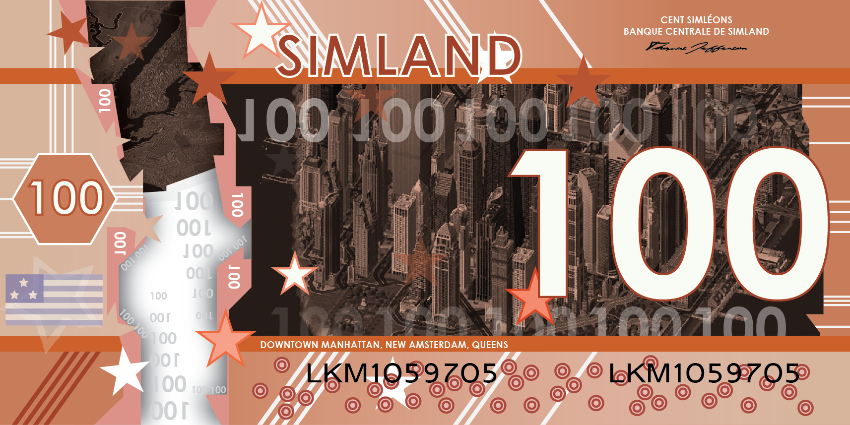 La première série de billets simlandais a été présentée officiellement le 22 mai dans la résidence du Vice-Président Charles Francis Christiaansens. Ils ont été désigné par Sim Hurban.