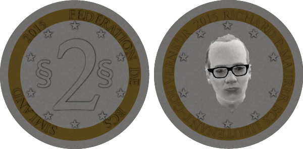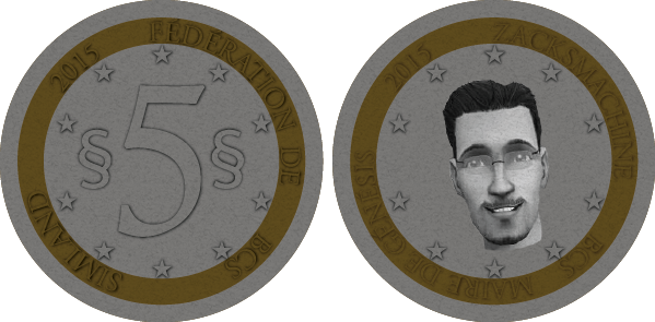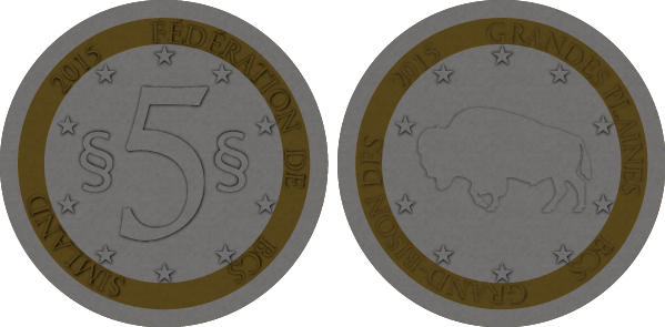 Cette pièce de 1 simléon est commune aux dix états fédérés de Simland. Son côté "face" représente le profil du créateur de Simland : Djay. |