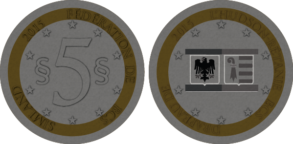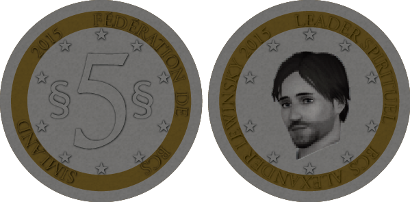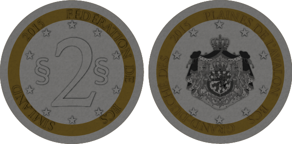 La pièce de 2 simléons illustre les armoiries de la République Démocratique du Lewsland, tandis que la pièce de 5 simléons est ornée du portrait du Leader Spirituel du Lewsland : Alex Lews. |