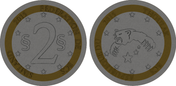 La pièce de 2 simléons est illustrée par les armoiries de la République Socialiste du Thoulak. La pièce de 5 simléons est ornée du portrait de l'ancien Président de la Fédération et Leader spirituel du Thoulak : Napoléon la Violette. |