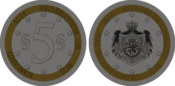 Les pièces de 2 et 5 simléons possèdent la même "face" : les armoiries de l'état avalonien. |