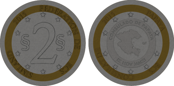 La pièce de 2 simléons arbore le sceau de l'état papaïotte. La pièce de 5 simléons est ornée de la clé de Mercentile qui est un des symboles de la capitale de Papaya. |