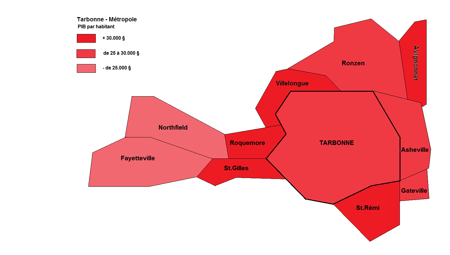 La région de Tarbonne concentre le PIB/hab. le plus important de tout le département avec des pointes à plus de 30.000 § dans certaines communes péri-urbaines de la grande banlieue.