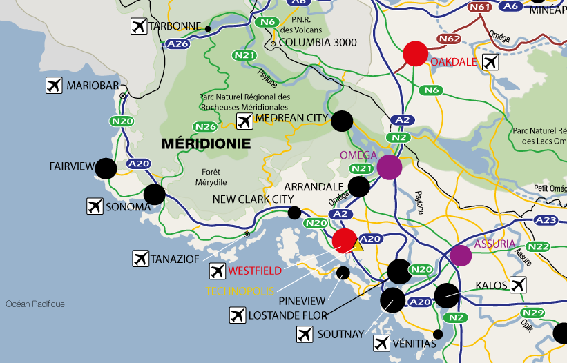 Ville ancienne : AkalinaAkasakiAntamiAntariaApolineApolticaApoltipolisArrandaleBeaufort la NouvelleDoramasEslandiasFairviewFukuotaHarlanHitoshinpûHunriseIzumoKalosKamitoshiLa Crescenta-MontroseLeikleLos ApachesLybriaMariobarMataroMérydileMontisimsMoquannesNeverlandNorthmoundNew Clark CityNouvelle-EspérancePalmierePineviewRéaumurSaint-Artis-en-CanyonSan VergaraScrinderSloapsSoutnaySpringfieldTalgin TownTanaziofTarbonneTechnopolisTerra NovaTossa BlancaTha BayVenitiasWakashimaWestfieldZoeltendam