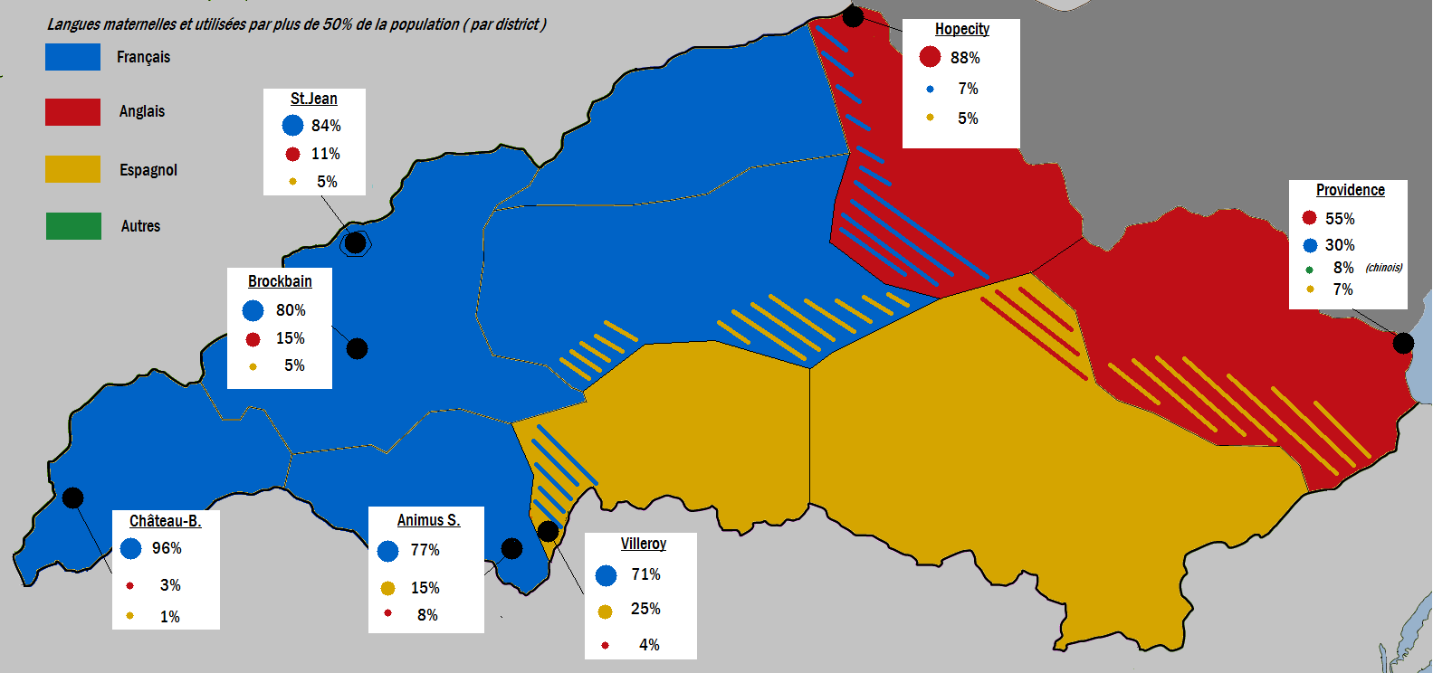 Trois groupes linguistiques se distinguent parfaitement géographiquement : le ouest et le nord de l'Etat regroupent une majorité de francophones, l'est d'anglophones et le sud d'hispanophones; la colonisation a joué un rôle prépondérant dans cette répartition renforcée de nos jours par la prédominance du français dans l'Etat voisin du Maxisland notamment, de l'anglais au Queens et en Alaska et de l'espagnol en Génésie ce qui explique que les trois langues sont reconnues comme officielles aux Grandes Plaines. Cette répartition n'est pas égale au niveau étatique puisque les francophones représentent la moitié de la population de l'Etat en forte augmentation, les anglophones eux environ 35% - stables - et les hispanophones se partagent les 10% restant (en nette baisse) avec d'autres langues qui elles montent en flèche tout en restant localisées, comme par exemple le chinois, dont la population d'origine immigre fortement à Providence.