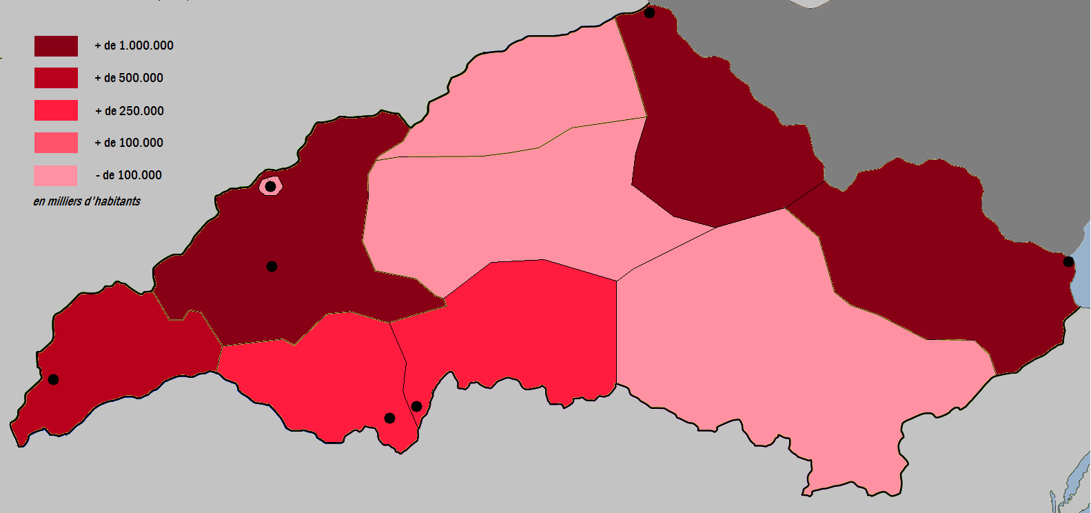 Le reste de l'Etat reste peu peuplé ( Plaines du Nord, Plaines Centrales, Spiritains ) du fait notamment d'un environnement hostile à toute culture (désert des Grandes Plaines); seul l' Inaka semble connaitre un renouveau démographique avec l'arrivée de Villeroy.