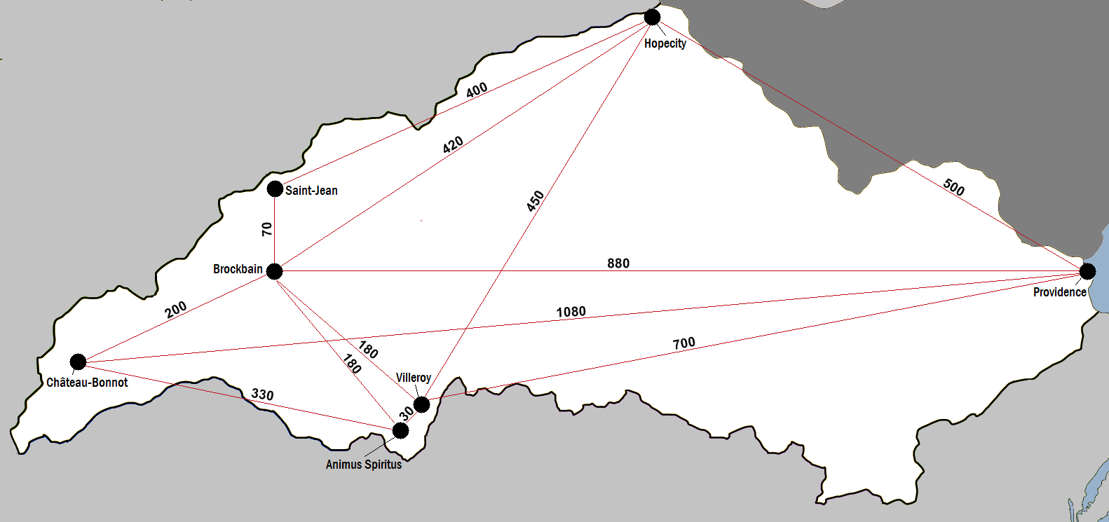D'une superficie de 550.000 km2, l'Etat s'étire sur près de 1200kms d'est en ouest (Providence et Château Bonnot sont à 1080 kms l'une de l'autre) et environ 500 kms de nord en sud. Les Grandes Plaines disposent une côte Pacifique de 60 kms coincée entre le Queens au sud et l' Etat américain d'Alaska au nord.