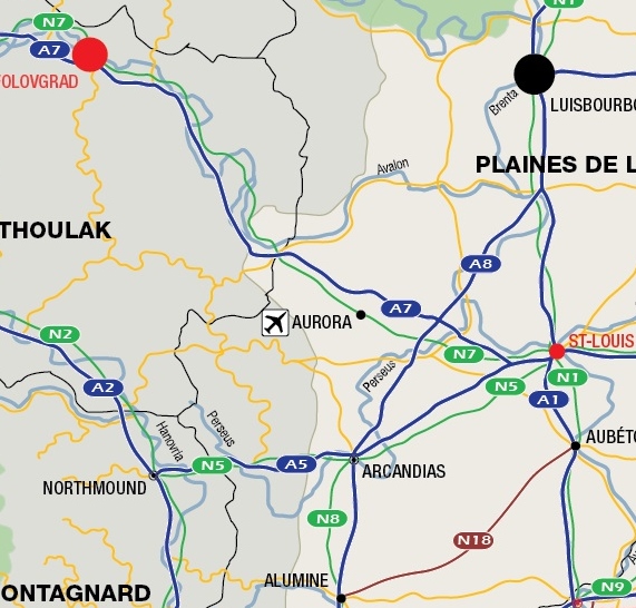 La ville d'Aurora est située sur la N7, menant de St-Louis sur Avalon à Folovgrad. Les voies routières du Centre ville ont fait l'objet d'un grand plan de désengorgement mené par le Bourgmestre. La plupart des rues du centre historique, parfois encore pavée qui était chaque jour encombrée, ce sont vue transformée en avenue à 2 voir 4 bandes de circulation rapide. L'agglomération est ceinturée par une voie rapide à 4 bandes, le centre est lui ceinturé par les boulevards, construit à l'emplacement des anciennes murailles.