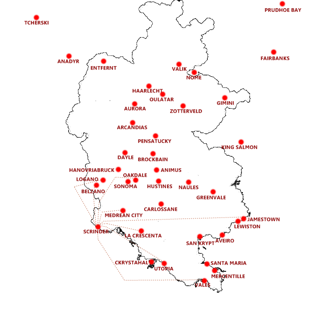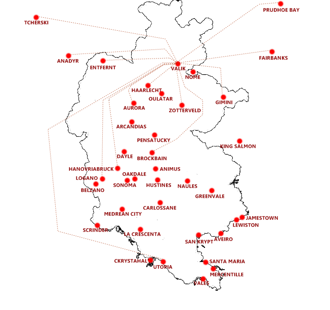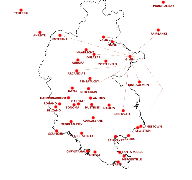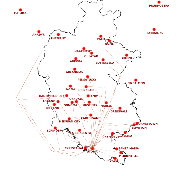• Hub d'Utopia : base principale du Groupe, c'est depuis cet aéroport que le plus grand nombre de vols sont opérés, essentiellement vers l'Asie et l'Amérique.