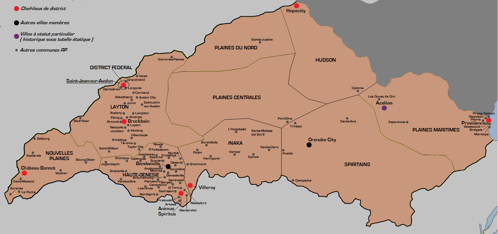 | Lewsland · Plaines de l'Avalon · Hudson(Etat) · Thoulak · Grandes Plaines · Queens · Génésie · Méridionie · Papaya · Whamphalie | |