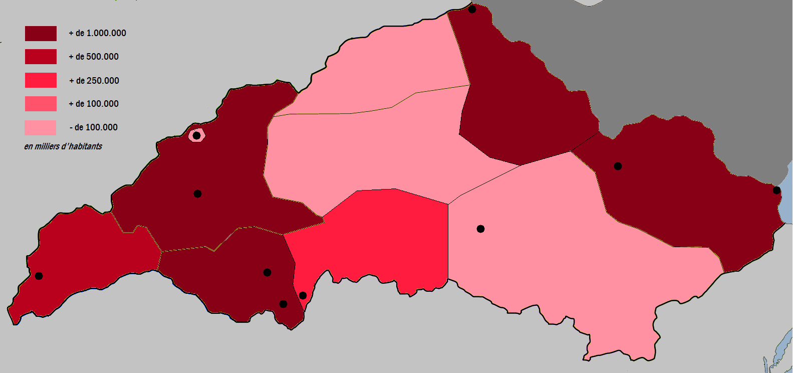 Le reste de l'Etat reste peu peuplé ( Plaines du Nord, Plaines Centrales, Spiritains ) du fait notamment d'un environnement hostile à toute culture (désert des Grandes Plaines); seul l' Inaka semble connaitre un renouveau démographique avec l'arrivée de Villeroy et plus récemment les Spiritains avec Orenoke City.