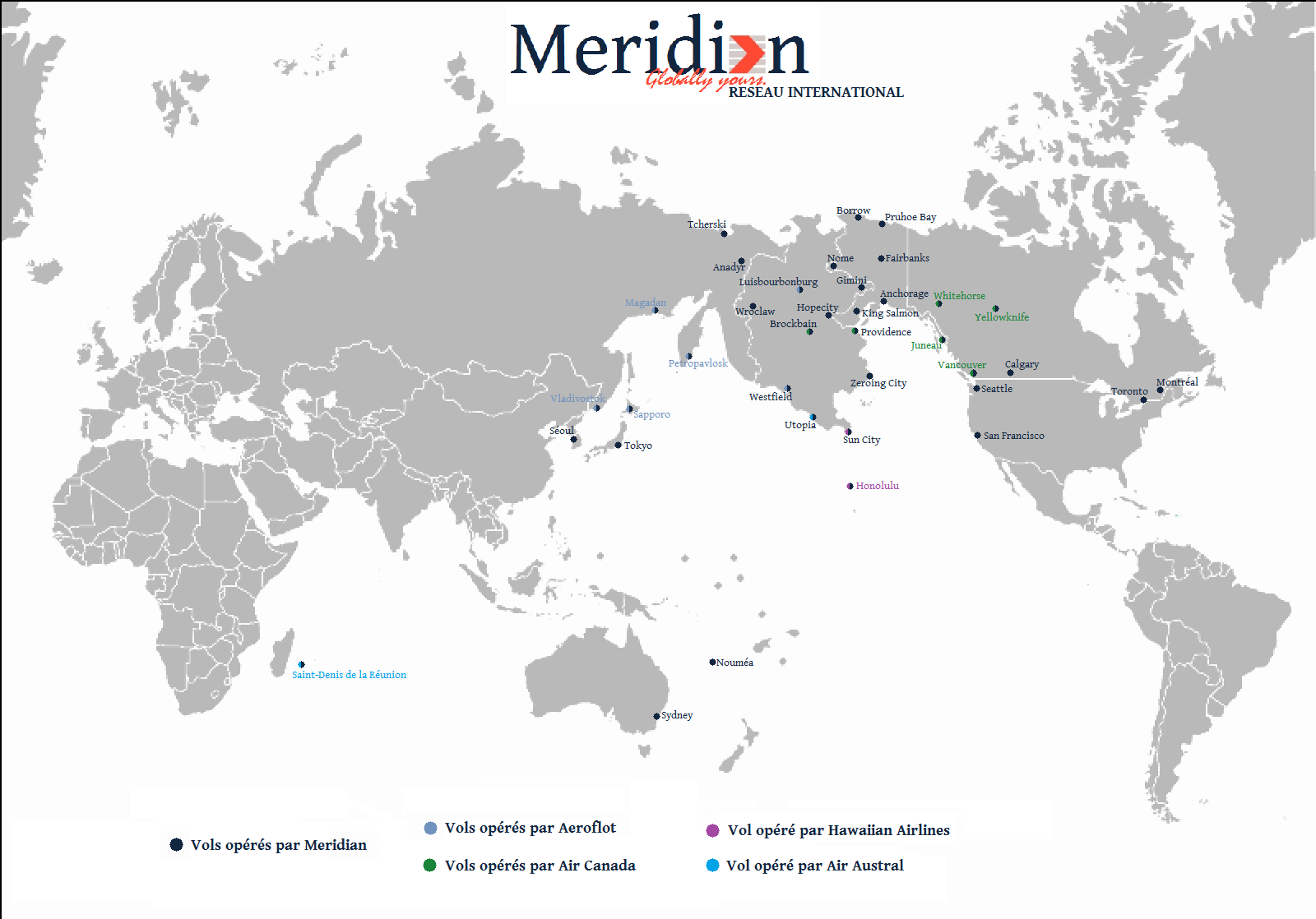 Afin d'augmenter la vente de ses billets, Meridian Airlines a passé des accords avec les compagnies Aeroflot, Air Austral, Air Canada et Hawaiian Airlines. Ces quatre compagnies assurent à l'heure actuelle des vols réguliers vers Petropavlosk, Saint-Denis de la Réunion, Vancouver et Honolulu, offrant ainsi aux clients d'Air Méridional une quinzaine de destinations supplémentaires vers l'Asie, l'Océanie, le Pacifique ou encore l'Amérique du Nord. 40% des billets vendus sur ces vols opérés par ces deux compagnies ont été attribués aux passagers de la compagnie simlandaise.