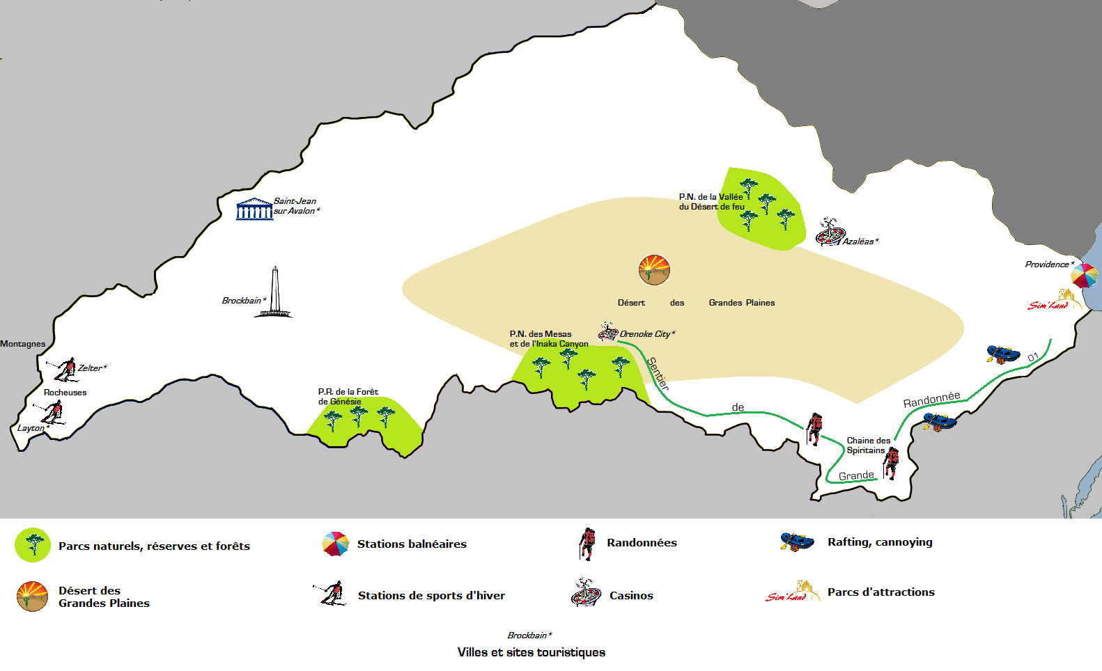 Le reste de l'Etat reste peu peuplé ( Plaines du Nord, Plaines Centrales, Spiritains ) du fait notamment d'un environnement hostile à toute culture (désert des Grandes Plaines); seul l' Inaka semble connaitre un renouveau démographique avec l'arrivée de Villeroy.
